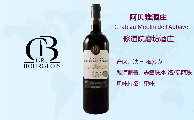 磨坊酒莊紅葡萄酒Chateau Moulin de l'Abbaye阿貝雅酒莊干紅葡萄酒 法國修道院磨坊城堡古堡莊園干紅葡萄酒 法國梅多克中級酒莊榜上有名Crus Bourgeois