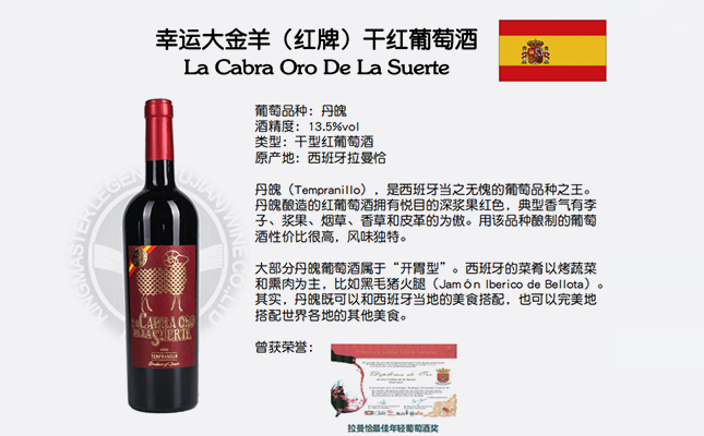 西班牙幸運(yùn)大金羊(紅牌)干紅葡萄酒,La Cabra Oro De La Suerte,幸運(yùn)大金羊(黑牌)干紅葡萄酒,La Cabra Oro De La Suerte,曾榮譽(yù)獲得拉曼恰最佳年輕葡萄酒獎(jiǎng)。