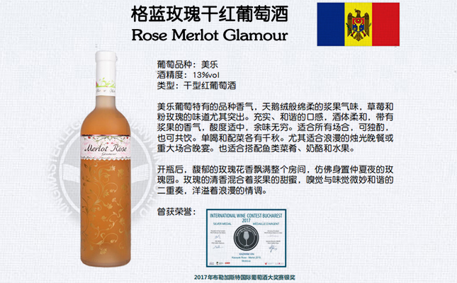 格藍(lán)玫瑰干紅葡萄酒,Rose Merlot Glamour,莫吉托薄荷起泡酒,莫吉托青檸起泡酒,開瓶后馥郁的玫瑰花香飄滿整個(gè)房間,仿佛身置仲夏夜的玫瑰園。玫瑰的清香混合著漿果的甜蜜,嗅覺與味覺微妙和諧的二重奏,洋溢著浪漫的情調(diào)。榮獲2017年布勒加斯特國(guó)際葡萄酒大獎(jiǎng)賽銀獎(jiǎng)!